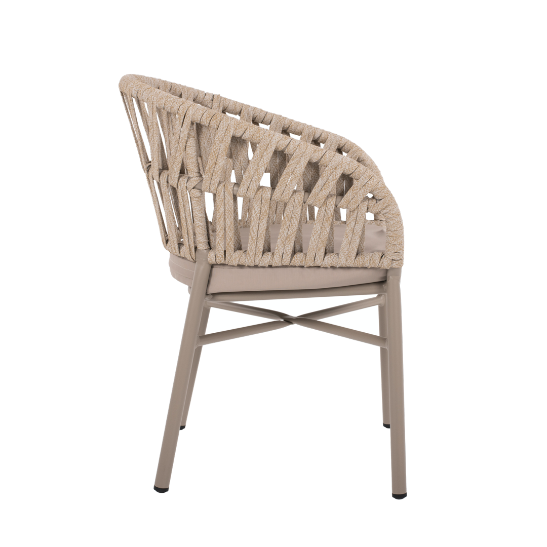 Кресло HM5857 е изработен от прахово боядисана алуминиева конструкция, която го прави устойчив на всякакви атмосферни условия. Около алуминиевата рамка на облегалката са усукани ръчно тъкани синтетични въжета. Креслото се предлага с възглавница на седалката, която осигурява оптимален комфорт. Използван на открито или закрито, този модел ще предложи съвремен допир и уютно усещане, независимо от сезона към всяко пространство, както в домашна обстановка, така и за масова експлоатация. Предлага се в няколко цветови комбинации.