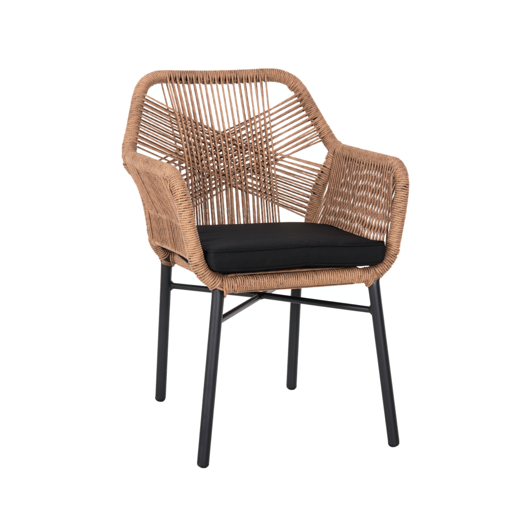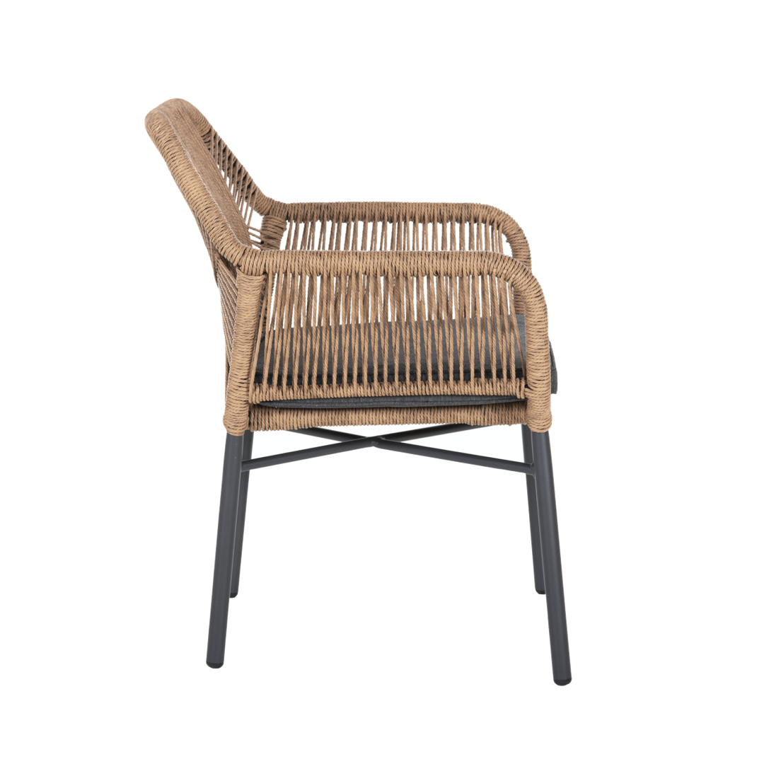Кресло TOPIN е изработен от прахово боядисана алуминиева конструкция, която го прави устойчив на всякакви атмосферни условия. Предлага се в два цвята на рамката: черна или антрацит. Около алуминиевата рамка на облегалката са усукани ръчно тъкан синтетичен ратан. Креслото се предлага с възглавница на седалката, която осигурява оптимален комфорт. Използван на открито или закрито, този модел ще предложи съвремен допир и уютно усещане, независимо от сезона към всяко пространство, както в домашна обстановка, така и за масова експлоатация.